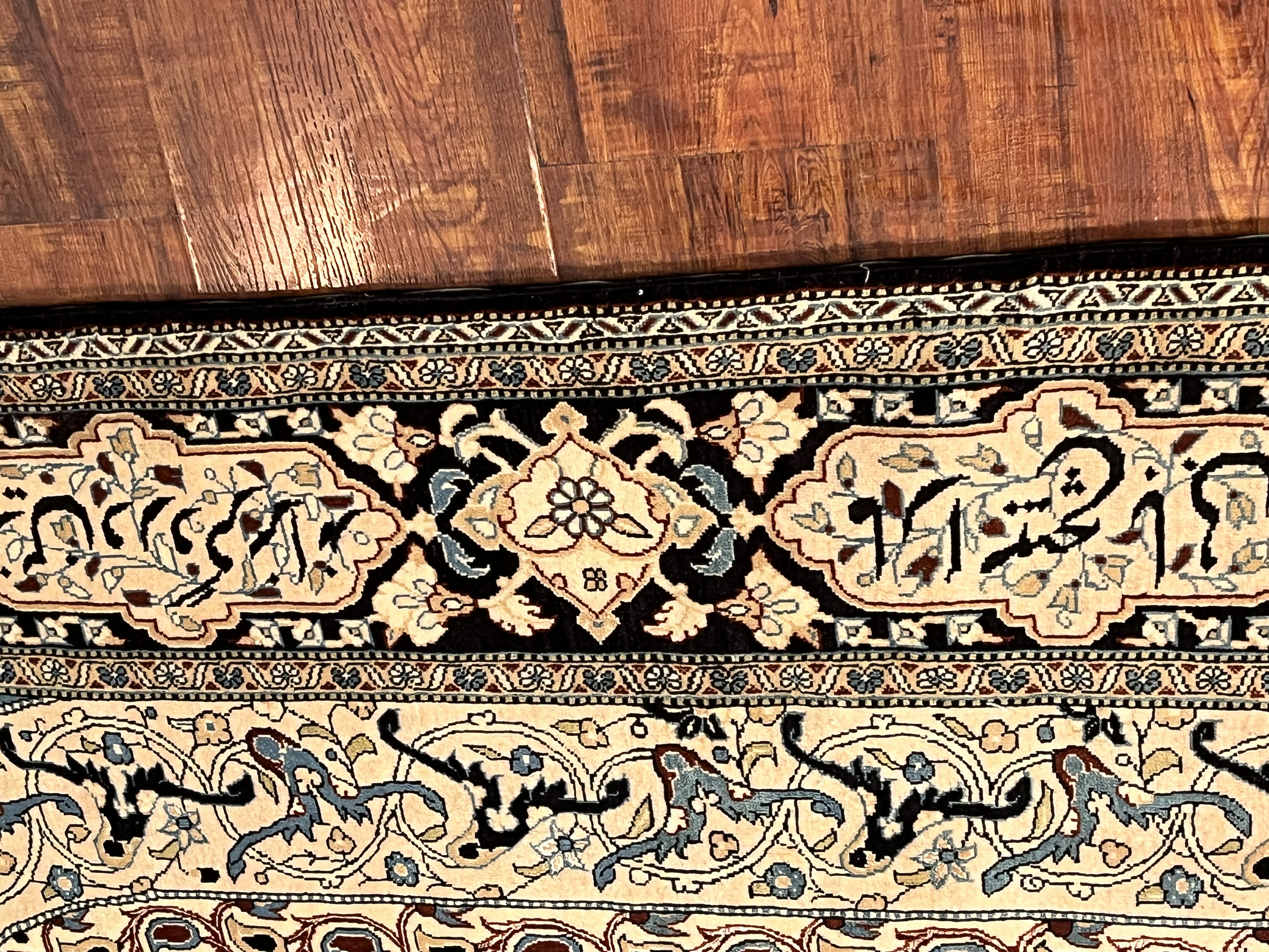 فرش دستبافت بافت قم نقشه غلط کتیبه ای تخت جمشید رنگ زمینه آبی رج شمار ۴۰ گل ابریشم اندازه ۲۵۸ در ۱۶۵ سانتی متر