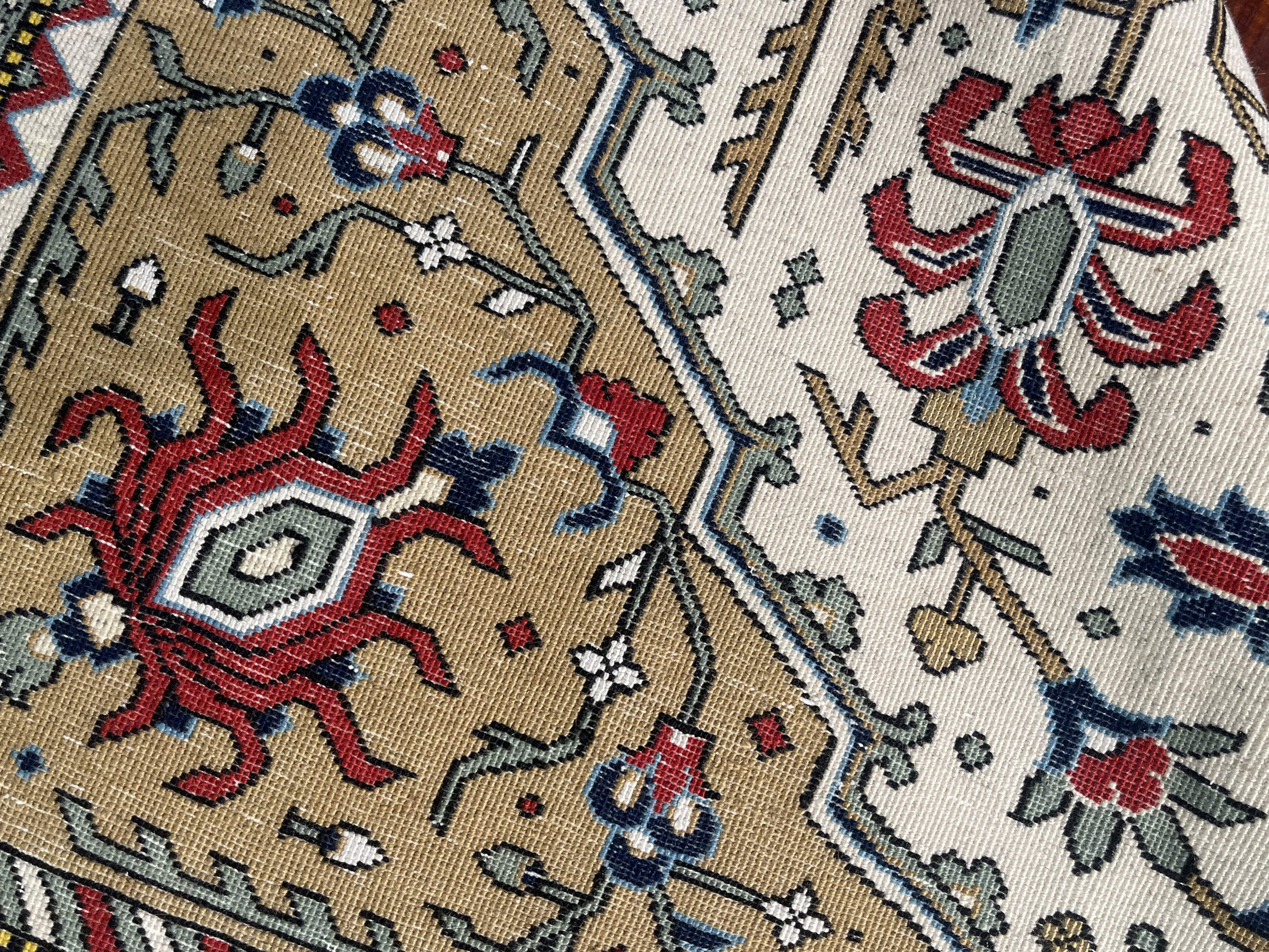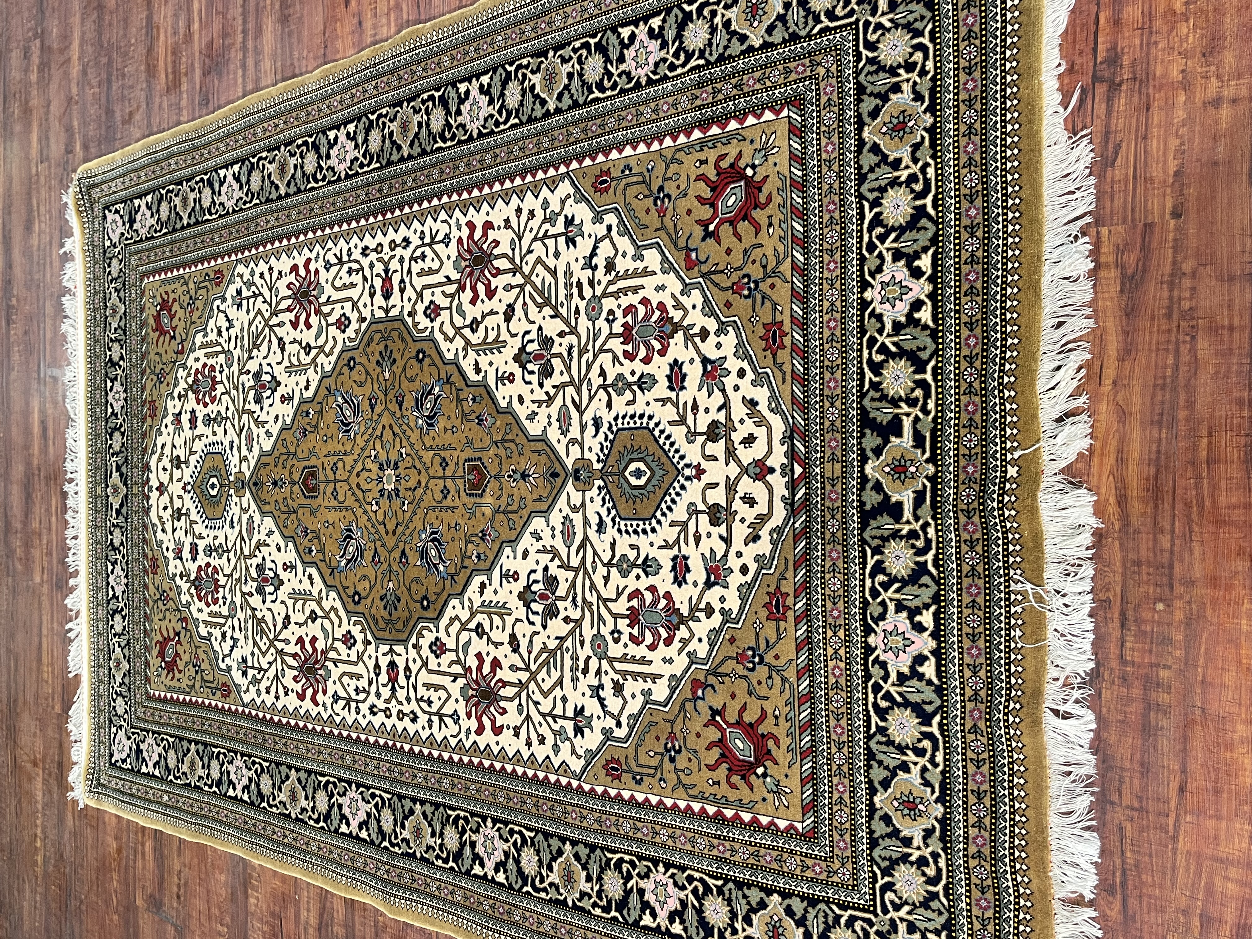 فرش دستبافت بافت قم رشتی زاده نقشه شاخ شکسته رنگ زمینه کردم گل ابریشم چله ابریشم اندازه ۲۰۲ در ۱۳۶ سانتی متر