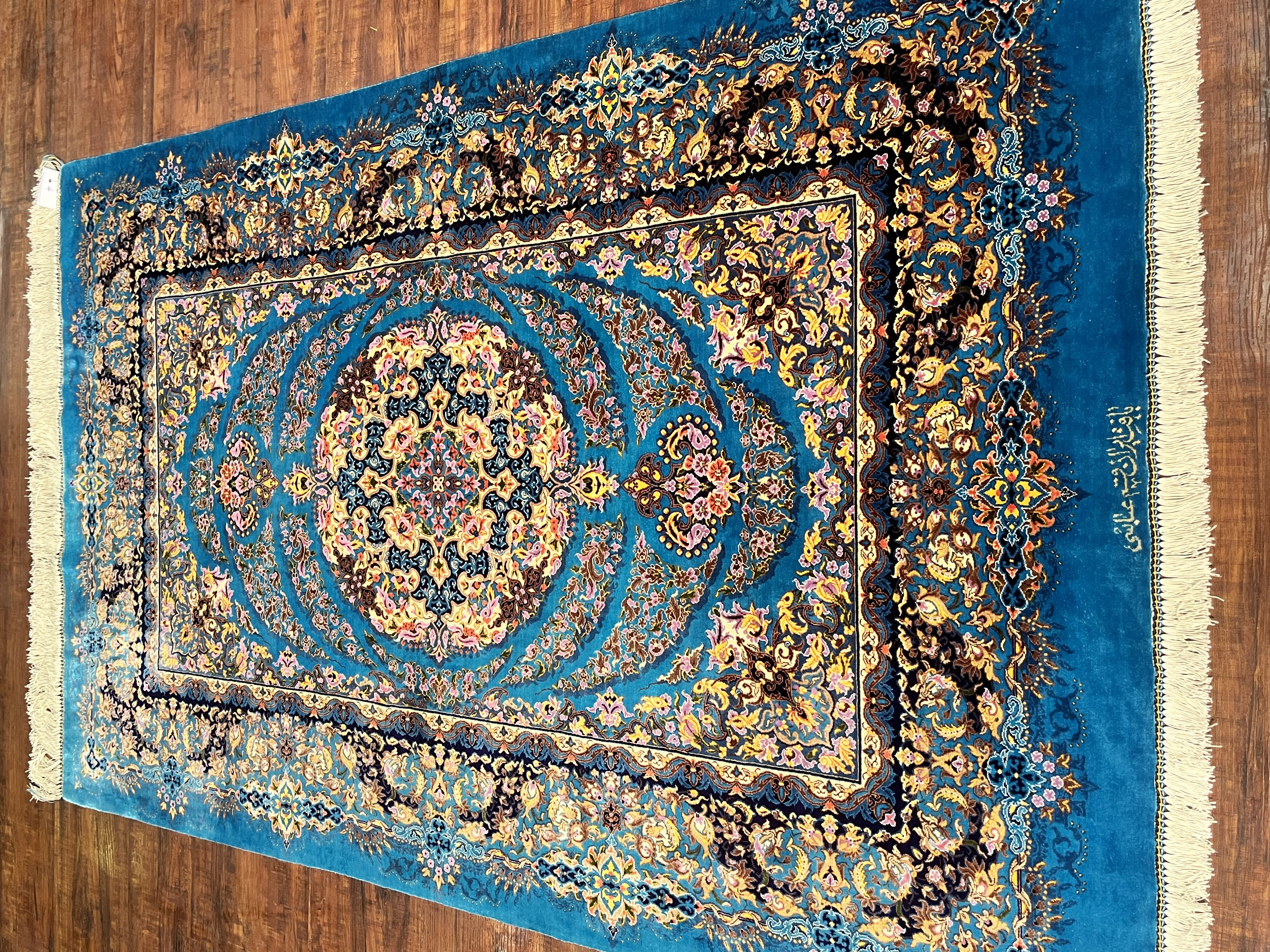 دستهبندی: فرش هایه قمجنس: تمام ابریشمبافت: قممارک: ایران قم عباسیرنگ زمینه: ابینقشه : ترنجیطول : ۱۵۶ سانتی مترعرض : ۱۰۰ سانتی مترنمایش بیشتر